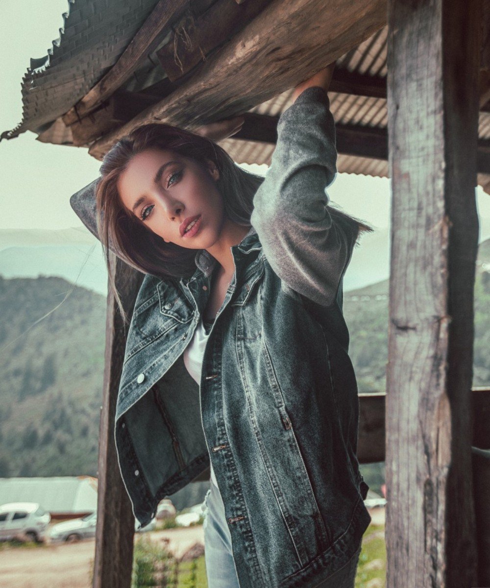 A beautiful girl with a pure innocent soul in a farm atmosphere in the mountains. The perfect combination of the beauty of nature and human labor.
